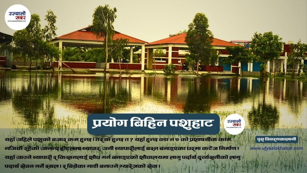 ५३ वटा सर्टर निर्माण गरेर यहाँ के व्यापार होला ? त्यो यो निर्माणमा सहभागी भएका व्यापारीले पनि पक्कै अनुमान गरेरै लगानी गरेका पनि होलान । तर अहिले यो संरचनाका कारण पशुहाट डुबानमा परेको छ । चौपायाको ब्यापार गर्ने ठाउँमा । बाँध्ने ठाउँमा समेत पानी डम्केपछि यहाँ चौपाया लीएर आएका व्यापारीपनि यत्तीकै फर्केका छन् । यो घटना हो गत असार ५ गते बुधबारको ।