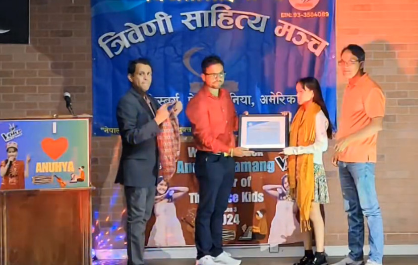 अमेरिका, १२ भदौ । त्रिवेणी साहित्य मञ्चले ग्रेटर ह्यारिसबर्गमा एक भव्य सांगीतिक कार्यक्रमकाबीच द भ्वास किड्स सिजन ३ कि विजेता नेपालीभाषी भुटानी सन्तान अनुया तामाङलाई सम्मानित गरेको गरेको छ ।