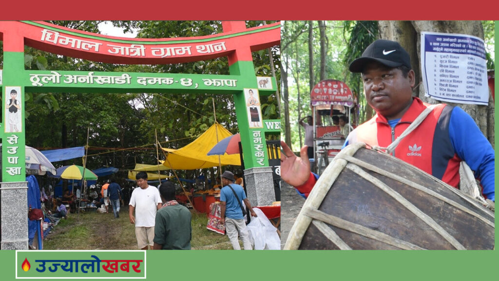 झापाको दमक ४ स्थित ठुलो अर्नाखाडी । जहाँ धिमालहरुको जात्रीथान हो । यहाँ बुधबार निकै भीडभाड थियो । धिमालहरु आफ्नो जातीय पहिरनमा सजिएर आएका थिए । कोही ढोल बजाउँदै उत्साहका साथ आएका दृष्य पनि यहाँ देखिन्थ्यो ।