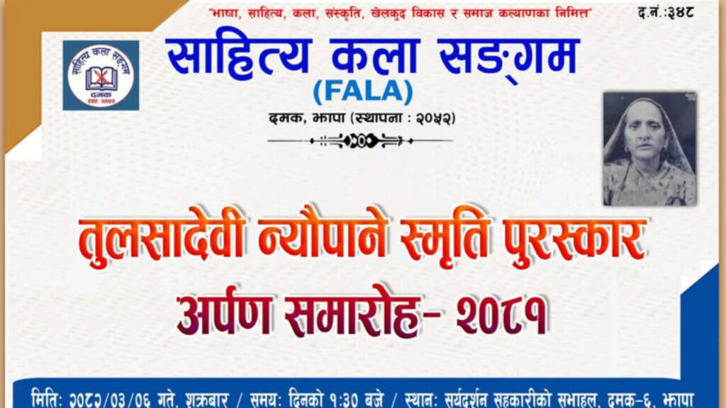 न्यौपाने परिवारले खडा गरेको १० लाखको अक्षयकोषमार्फत शुक्रबार साहित्य कला संगमको आयोजनामा तुलसादेवी न्यौपाने स्मृति पुरस्कार २०८१ बाट हिमालय माविकी शिक्षक नैनकला थेवे सम्मानित बन्नु भयो । कार्यक्रमका प्रमुख अतिथि कमल वस्ती, कोषदाता छविराम न्यौपाने, डा. लेखनाथ न्यौपानेसहितबाट उहाँलाई नगद ५ हजारसहितले सम्मानित गरियो ।