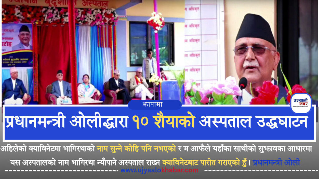 झापा, २८ असार । प्रधानमन्त्री केपी शर्मा ओलीले झापाको बुद्धशान्ति गाउँपालिकाको वडा नम्बर ३ मा रहेको १० शैयाको भागिरथा न्यौपाने नगर अस्पतालको उद्धघाटन गर्नुभएको छ ।