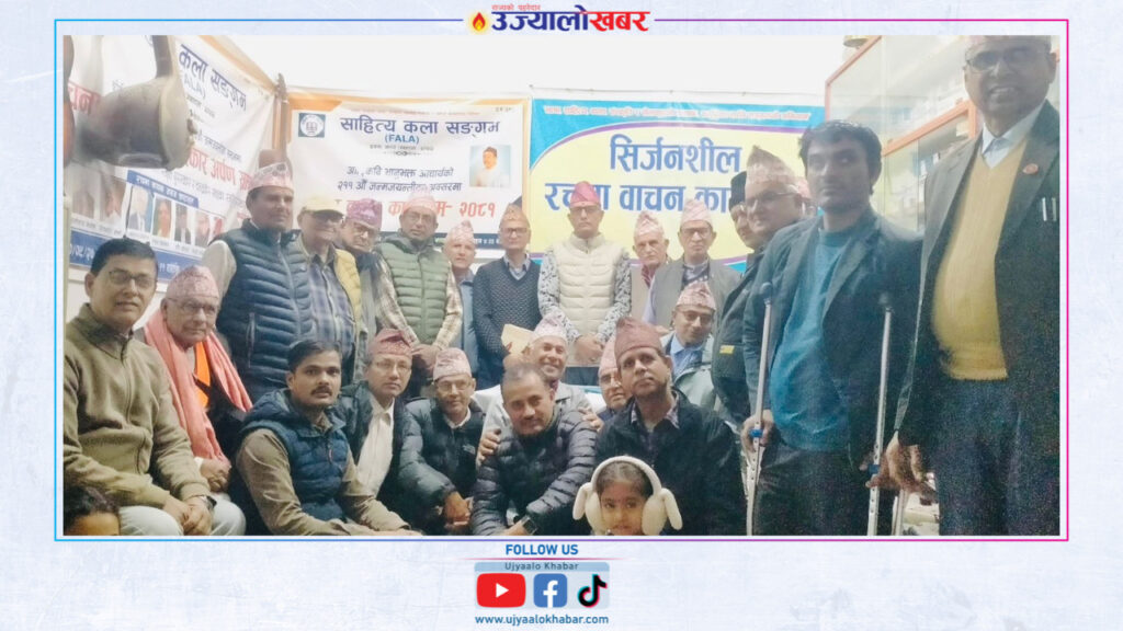 दमक,३ माघ । साहित्य कला सङ्गम दमकले आज आफ्नो ५८ औँ मासिक शृङ्खला संस्थाका अध्यक्ष श्री बिन्दु दहाल मूकदर्शकको अध्यक्षता एवम् सिक्किमका आदरणीय व्यक्तितत्व राजनचन्द्र शिवाकोटीको प्रमुख आतिथ्यमा भव्यरूपमा सुसम्पन्न भयो । उक्त अवसरमा साहित्यकला सङ्गमका सल्लाहकार तथा दमक प्रज्ञा प्रतिष्ठानका पूर्व अध्यक्ष हेमनाथ अधिकारी , सङ्गमका पूर्व अध्यक्ष तथा सल्लाहकार विष्णु न्यौपाने , प्रतिभा निकेतनका वर्तमान अध्यक्ष कमलराज भट्टराई , संस्थापक अध्यक्ष खेमलाल पोख्रेल , DPL का पूर्व अध्यक्ष दधिराम ढकाल , DPLकमलका पूर्व अध्यक्ष राजन चापागाईं , साहित्यकार नारायण शर्मा फुयाल , पदम ओली , देवु चापागाईं , लीलान्श भण्डारी , सङ्गमका उपाध्यक्ष त्रय यादव अधिकारी झाँक्रीखोले , दुर्गा काफ्ले , चन्द्रा गड्तौला ,महासचिव ओमप्रसाद खनाल ,सचिब बीरेन्द्र खड्का , सह सचिव मेघबन्धु खनाल , कोषाध्यक्ष नेत्र अधिकारी , सदस्य विवेक दुलाल क्षेत्री , रामकुमार उपाध्याय , ज्ञाननाथ निरौला ,साहित्यकार जीवनहरि शर्मा , गोपाल प्र दहाल , ज्ञानेन्द्र खड्का , किशोर खनाल , अम्बिका सापकोटा , उमा सुवेदी , यादव नेपाल , डिजायर नेपाल , ड्युसफ्ट नेपाल , त्रिलोचन रेग्मी , शान्त भट्टराई , खड्गबहादुर खड्का ,भक्ता दहाल , नेत्र दहाल , शिभानी चापागाई , प्रीति चापागाईंले कविता वाचन गर्नुभएको थियो । प्रमुख अतिथिले पूर्वीय दर्शनशास्त्रका कुराहरू प्रस्तुत गर्नुभएको थियो । कार्यक्रममा स्वागत मन्तव्य उपाध्यक्ष यादव अधिकारी झाँक्रीखोलेले गर्नुभएको थियो भने सञ्चालन संस्थाका महासचिव ओमप्रसाद खनालले गर्नुभएको थियो ।