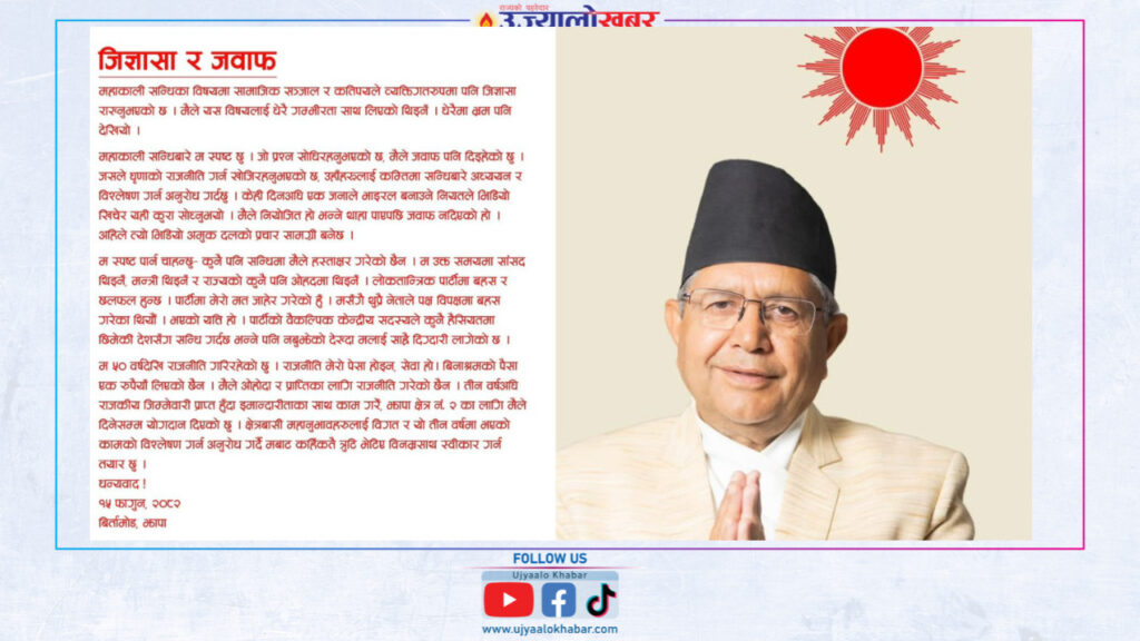 झापा ,१५ फागुन । झापा क्षेत्र नं. २ का प्रतिनिधिसभा सदस्यका उम्मेदवार देवराज घिमिरेले महाकाली सन्धिका विषयमा उठिरहेका जिज्ञासाबारे स्पष्टोक्ति दिनुभएको छ । सामाजिक सञ्जाल तथा व्यक्तिगत रूपमा सोधिएका प्रश्नलाई लिएर उहाँले आफूले उक्त सन्धिमा कुनै पनि रूपमा हस्ताक्षर नगरेको दाबी गर्नु भएको हो । घिमिरेले आज जारी गर्नुभएको विज्ञप्तिमा महाकाली सन्धिबारे आफू स्पष्ट रहेको र उठेका प्रश्नहरूको जवाफ दिइरहेको उल्लेख गर्नुभएको छ । सन्धिलाई लिएर भ्रम फैलाउने प्रयास भएको भन्दै उहाँले घृणाको राजनीति नगरी अध्ययन र विश्लेषण गर्न सम्बद्ध पक्षलाई आग्रह गर्नुभएको छ ।