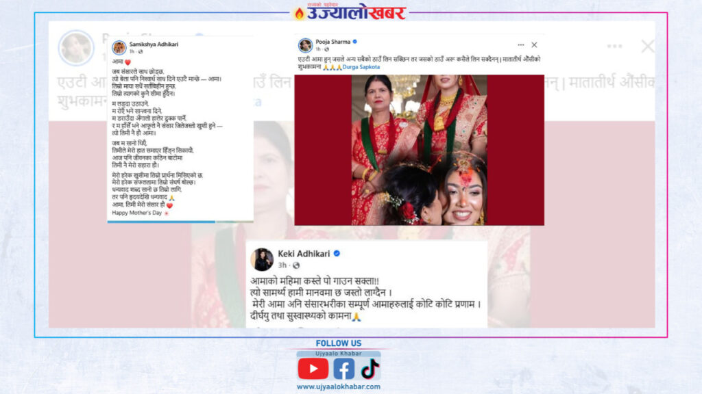 यसै क्रममा आजकै दिन कलाकारहरूको मन छुने शब्दहरूले सामाजिक सञ्जाल भावुक बनेको छ । धेरै कलाकारहरुले आफ्नो आमाप्रति माया देखाउँदै शब्दहरु दर्शाएका छन् । अभिनेत्री पूजा शर्मा लेख्नु भएको थियो,‘एउटी आमा हुन् जसले अन्य सबैको ठाउँ लिन सक्छिन्, तर जसको ठाउँ अरू कसैले लिन सक्दैनन् ।’
